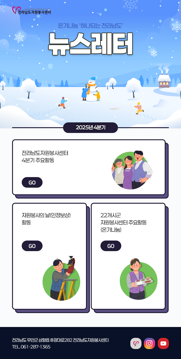 [2025년 4분기] 전라남도자원봉사센터 뉴스레터 페이지 정보 작성자 최고관리자 조회 46회 작성일 25-12-17 11:37 본문 목록 다음글[2025년 3분기] 전라남도자원봉사센터 뉴스레터 25.11.17